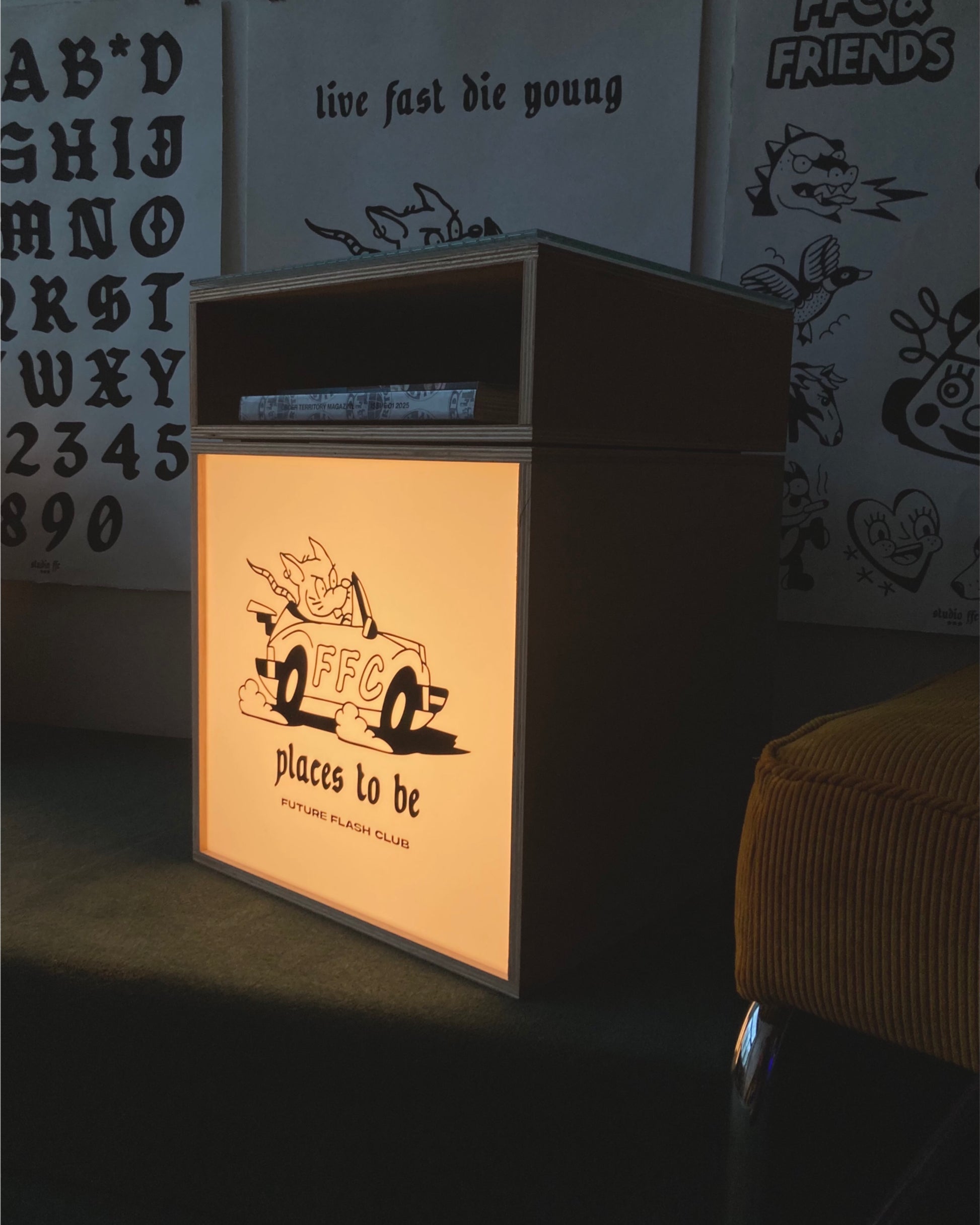 Vinyl 3mm front, made using recycled 12mm plywood, fitted with an LED light, EU mains and on/off switch.
